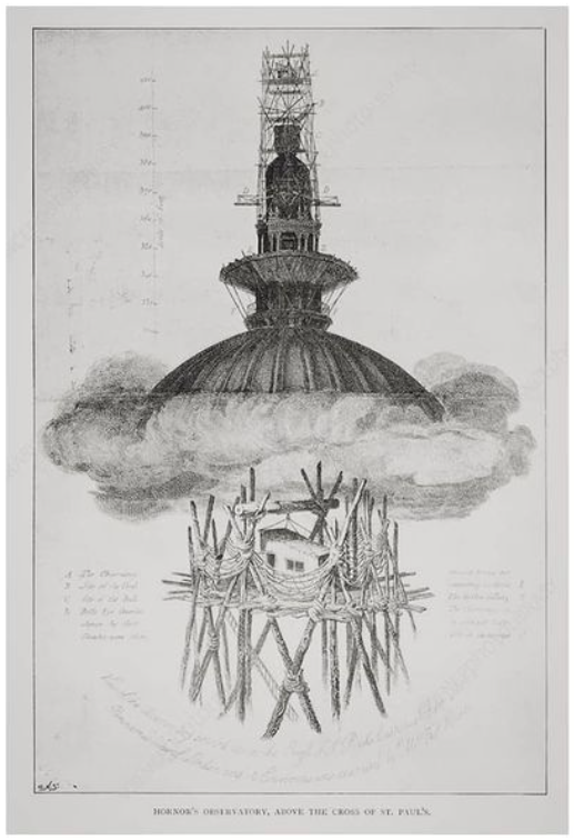 Thomas Hornor's scaffolding and hut on top of Saint Paul's Cathedral, London. Hornor used them to produce sketches for the huge panorama of London, exhibited at the Regent's park colosseum in the early 1800s.
