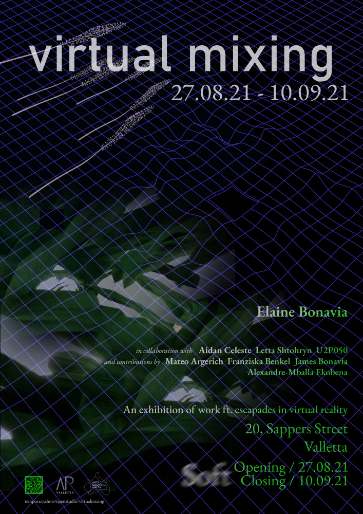 Virtual Mixing designates an interaction between effects which exist in different dimensions and on separate levels. This exhibition will open the [v]room of requirement to the public, an artwork by Elaine Bonavia and a space in virtual reality for self-dialogue, musing and reflection. Born out of introspection on her remote relations with Malta, some of the underlying themes in the work include unfulfilled desire, the notion of touching from a distance and shifting modes of perspectives and boundaries.