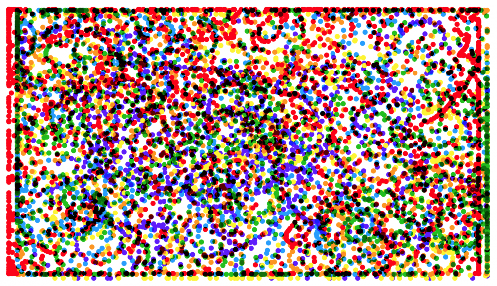 rubbing it in (asmr quarantine massage), 7x5 spreading quadrants, countless dots, stamp on chinese calligraphy paper, 2020, jb